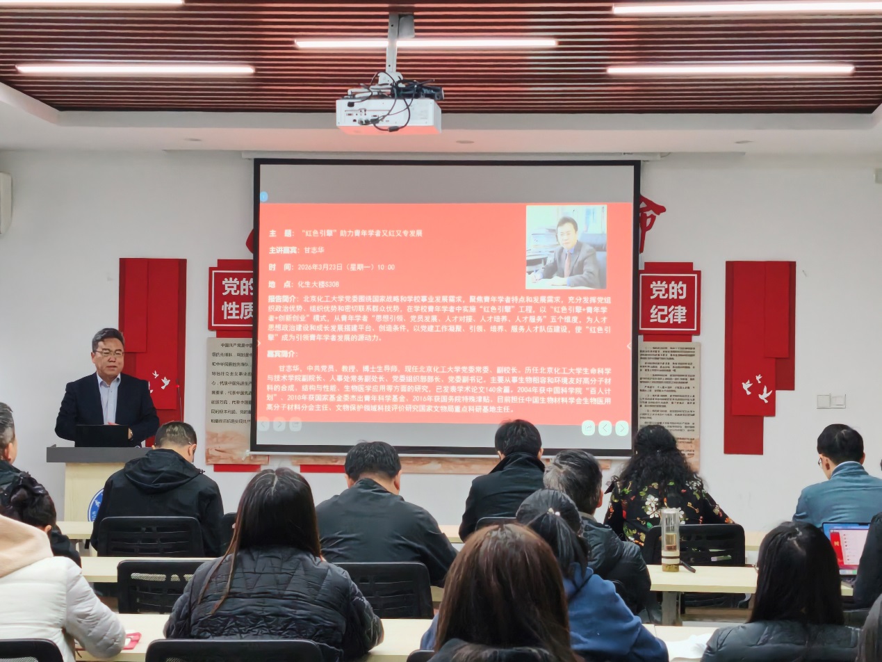 3月23日上午,成人影视片 (马赛学院)树立和践行正确政绩观学习教育读书班专题报告会在在化生大楼S308举行。北京化工大学党委常委、副校长甘志华教授受邀作“‘红色引擎’助力青年学者又红又专发展”专题报告。学院党委副书记、纪委书记叶楠主持报告会,学院树立和践行正确政绩观学习教育读书班成员、各教工党支部支委及研究生代表参加学习。