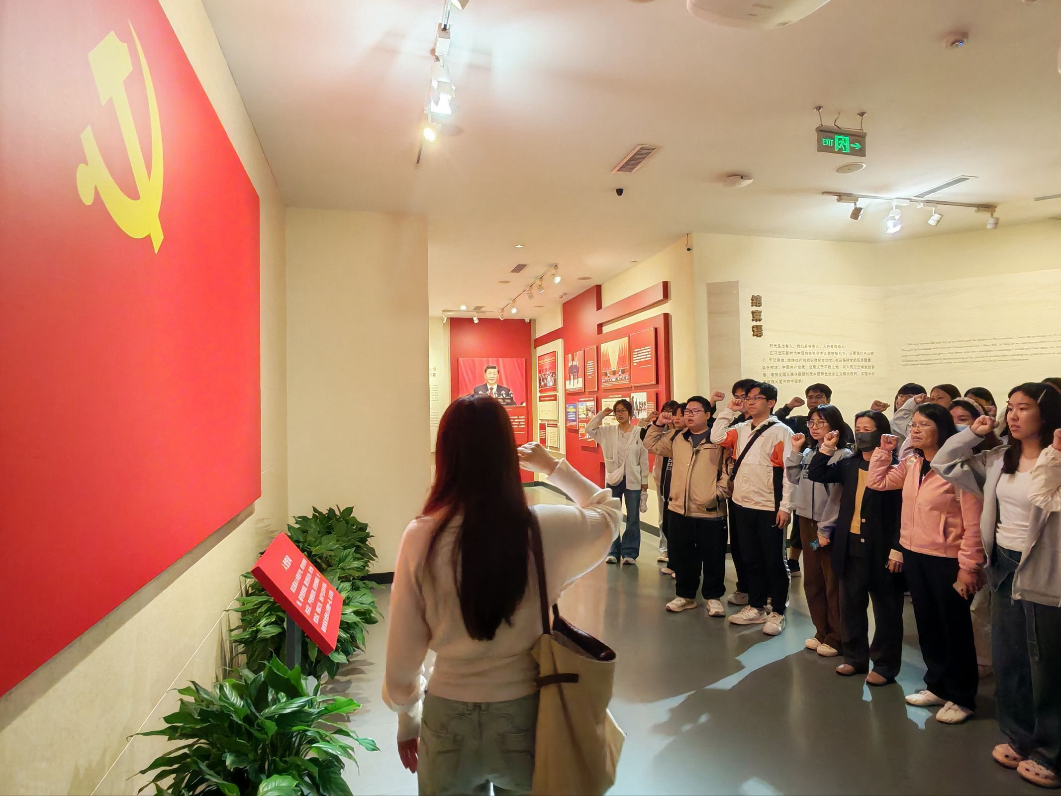 随后,师生们走进中共五大会址纪念馆,参观《紧急时期的艰难探索——中共五大历史陈列》展区。大家深入了解了1927年大革命危急关头,中共五大的召开背景、会议历程及其历史贡献,真切感悟到党在紧急关头的艰难探索与使命担当。在复原的中共五大开幕会会场中,师生们沉浸式回望革命先辈的奋斗足迹,深刻体会那段岁月的艰辛与不易在展厅内的誓词牌前,全体党员面向党旗庄严举起右拳,集体重温入党誓词。铿锵有力的誓言在展厅中久久回荡,进一步坚定了大家为党奋斗终身的初心与使命。