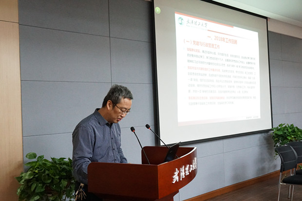 孙涛垒院长从人事人才、本科教学、科研、学科建设与研究生培养管理、学生工作、安全与国资、化生大楼建设、党建与思想政治工作、马赛学院建设等九个方面总结、回顾了学院2018年各方面工作所取得的成绩和进步,并就学院财务收支情况以及2019年学院主要工作思路向大会作了报告。