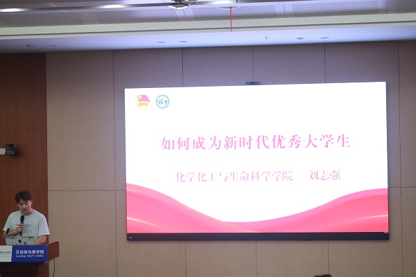 随后,由刘志强同学讲述新时代青年应该如何成长。应化20级刘志强同学本人在今年九月份成功保研浙江大学。就如何成为优秀新时代大学生,他指出同学们要坚持奋斗三部曲——有信念,好习惯,要坚持,并从课程学习、志愿服务、学生工作、科研竞赛和思想觉悟方面结合自身经历给同学们提出了宝贵的建议,用自己的科研经历告诉同学们要勇敢尝试、积极争取,为同学们在大学提供了前进方向。