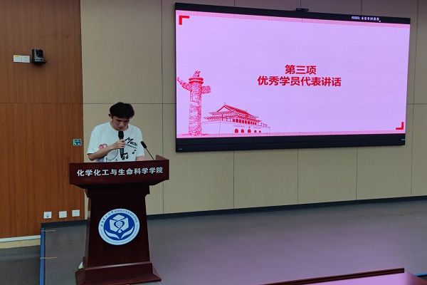 优秀学员代表黄天赐向培训班学员展示和分享了自己的所学所感,在发言中他表示将通过自身的示范和引领,将理论转化为实践,促进自我思想作风再提升,切实服务广大同学。